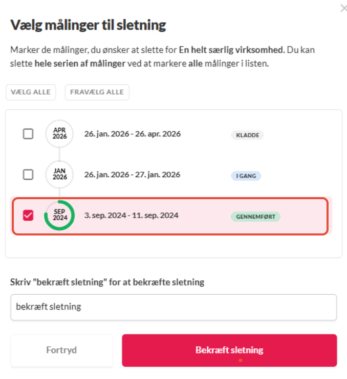 Hvis man i stedet vælger "Slet målinger", får man mulighed for at vælge hvilke eller hvilken måling, man gerne vil slette.