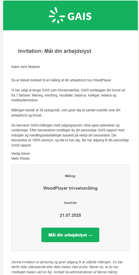 Du modtager en mail med en invitation til at besvare en GAIS-målingen. Når du trykker på knappen Mål din arbejdslyst, kommer du ind på GAIS-platformen.
