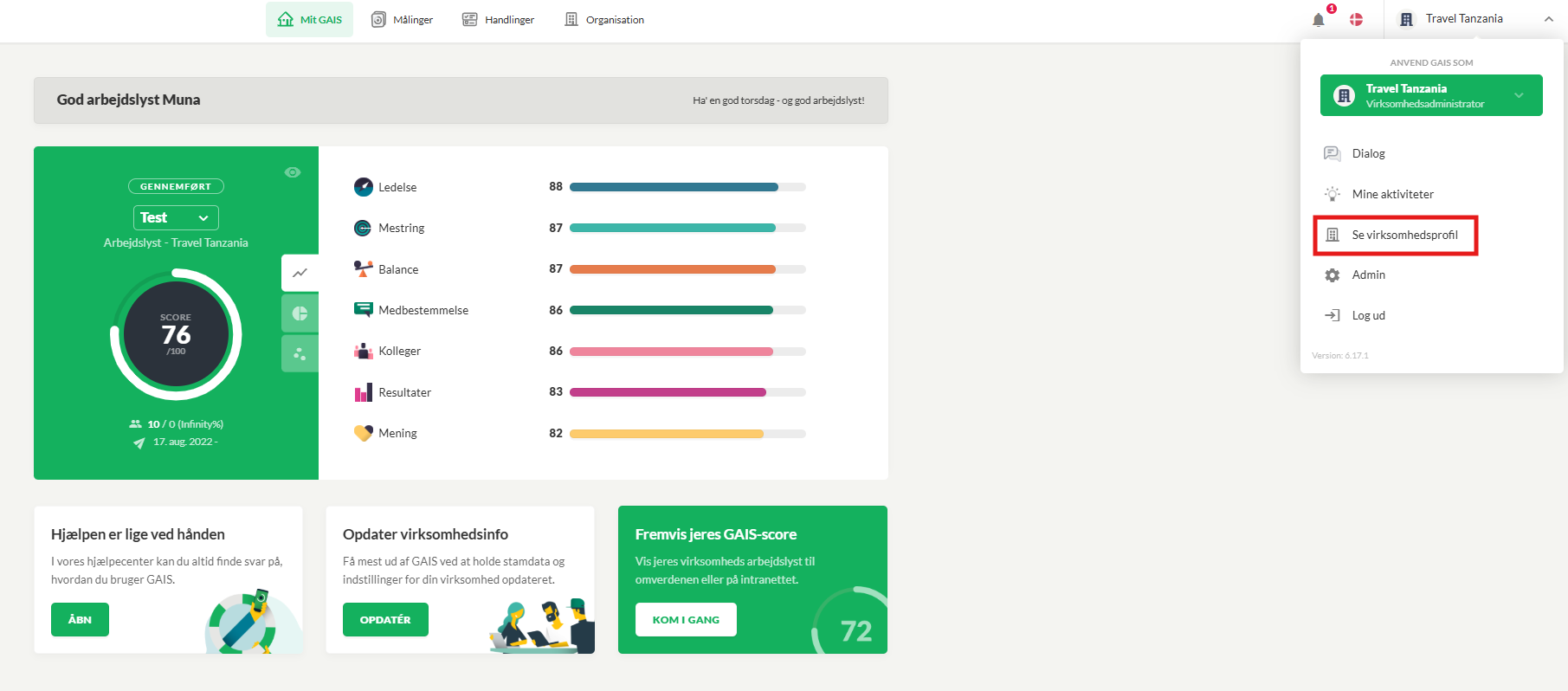 Modtagergruppen vil nu være synlig på listen. For at benytte modtagergruppen skal du gå til din Virksomhedsprofil, der findes i menuen i øverste højre hjørne med virksomhedens navn. Herefter tryk på Indstillinger - herfra kan du definere rettigheder vedr. oprettelse og modtagelse af handlinger, på samme måde som med ledere og medarbejdere beskrevet tidligere.