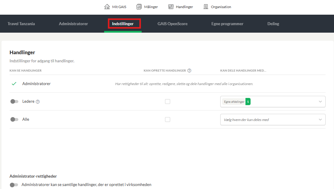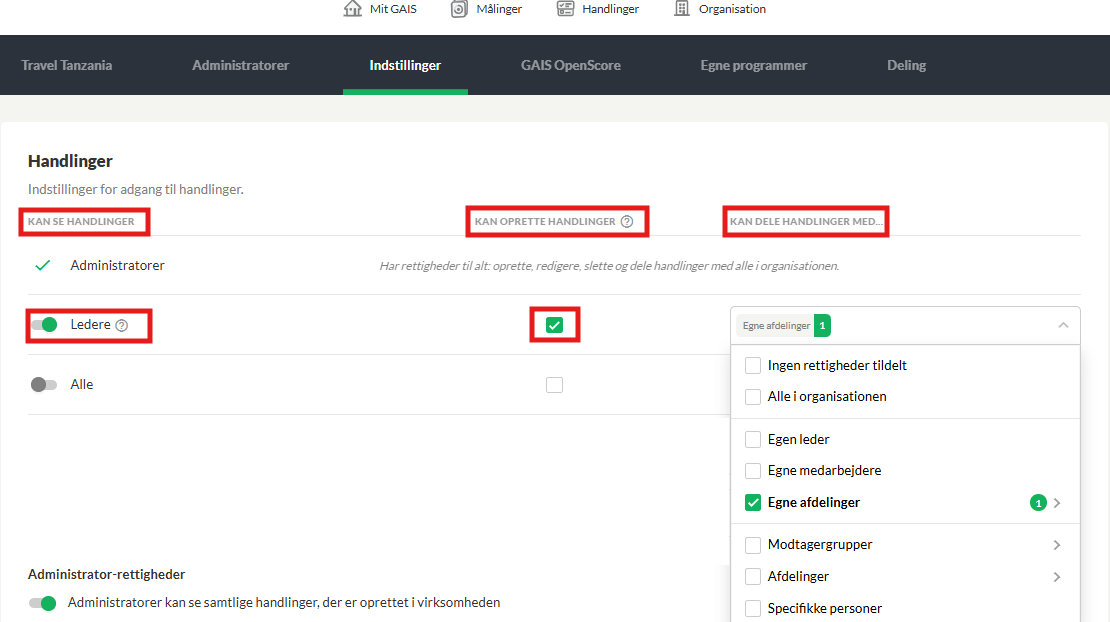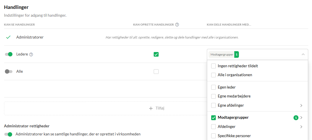 OBS: Hvis nogle af jeres ledere har flere afdelinger under sig, vil det være en fordel at vælge, at ledere kan dele handlinger med "Egne medarbejdere" i stedet for "Egne afdelinger" . På den måde kan lederne dele handlinger med medarbejdere, selvom de er i forskellige afdelinger.