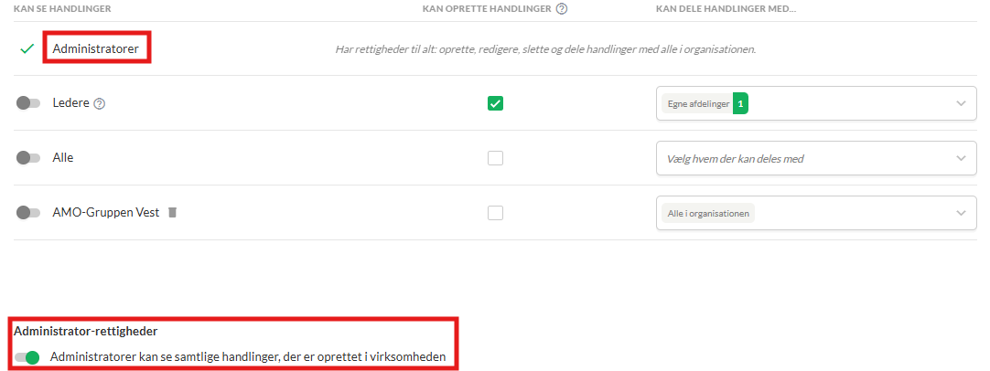 Du kan sætte flueben ved, at alle i organisationen kan se og oprette handlinger. Det gælder altså både medarbejdere og ledere.