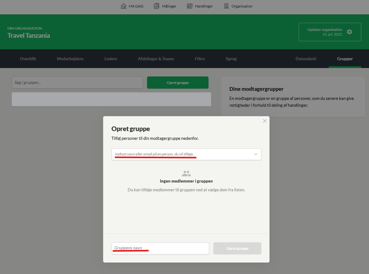 Der er også mulighed for at oprette modtagergrupper, der kan dele eller få tildelt handlinger - dette kan f.eks. være virksomhedens AMU-medarbejdere, der kan være spredt på afdelinger og funktioner. Modtagergrupper oprettes under Organisationen -> Grupper -> Opret gruppe. Her kan du oprette og navngive modtagergruppen samt vælge medlemmerne ved at: