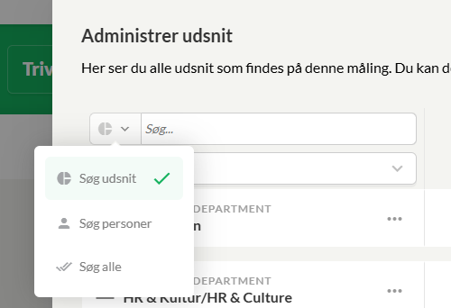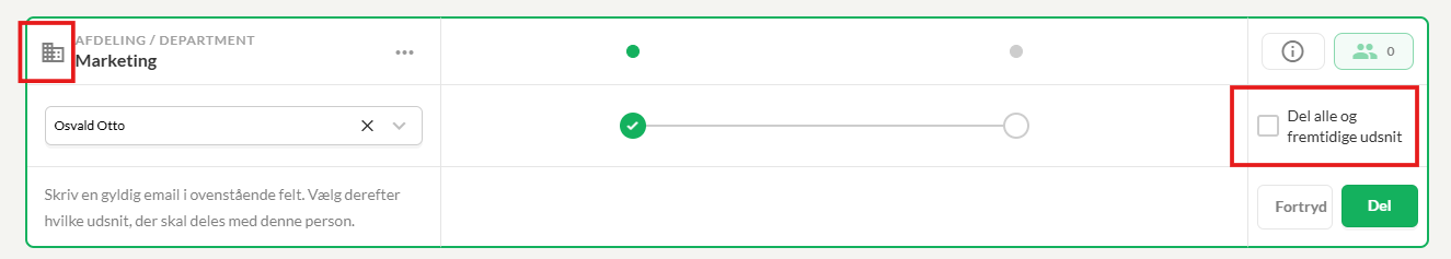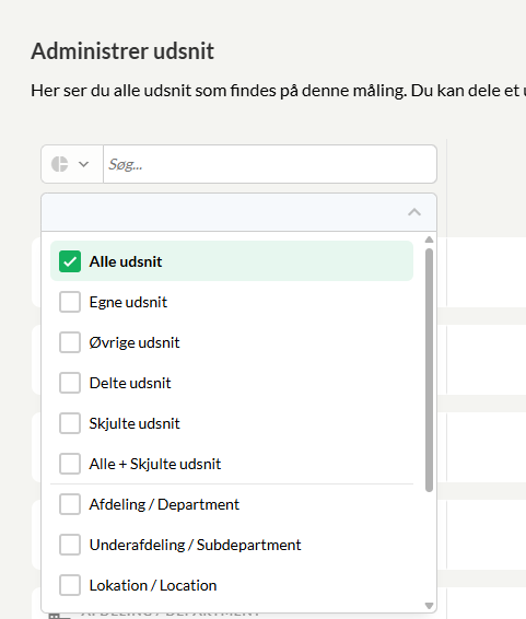 Hvis udsnittet er lavet på organisations niveau, kan man vælge "del alle og fremtidige udsnit". Hvis dette vælges, vil udsnittet automatisk blive delt, når en ny måling starter, der indeholder samme udsnitsnavn.