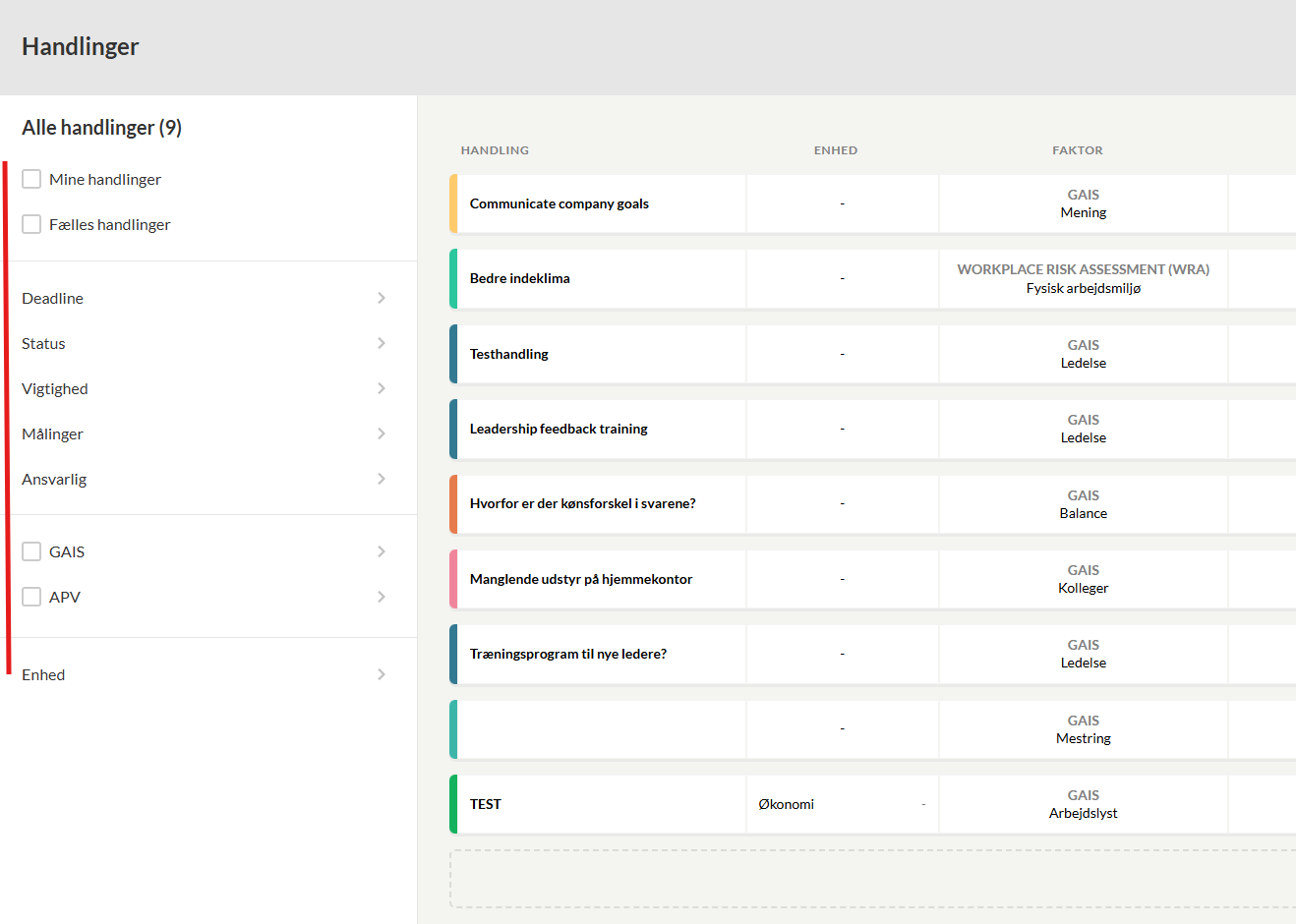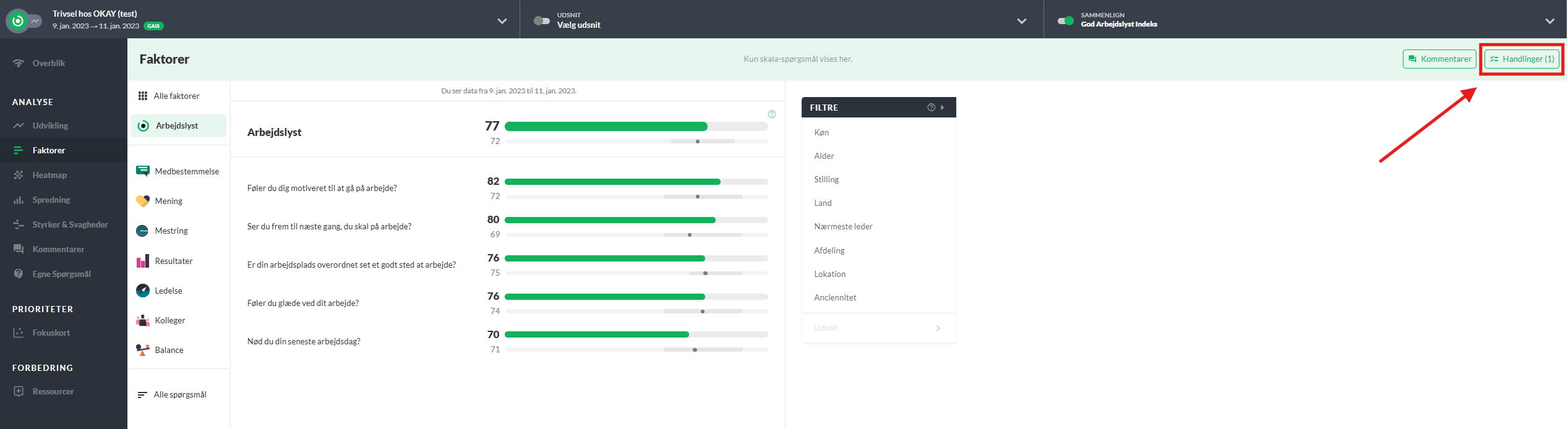 Hvis du er administrator for virksomheden, vil du kunne se knappen Handlinger i øverste, højre hjørne af rapporten. Herfra kan du også oprette nye handlinger og se, hvilke handlinger du selv har oprettet ud fra de enkelte faktorer i denne rapport. Er din handling ikke tilknyttet en faktor, vises den ikke her, men kun i handlingscenteret.