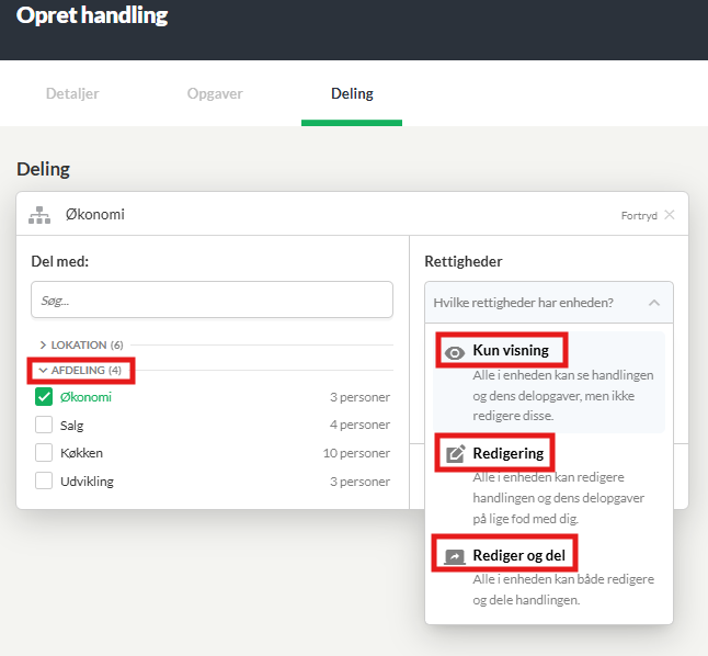 Under punktet Deling kan du dele dine handlinger med andre i organisationen. Delingsmuligheder er inddelt i fire kategorier: