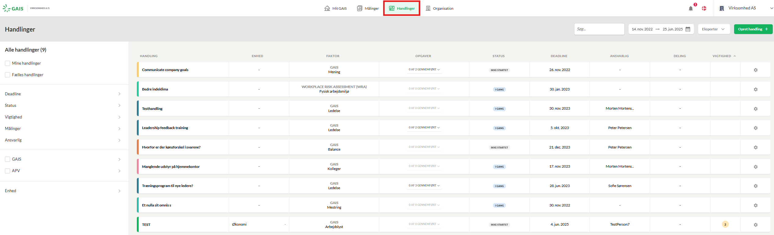 Via søgefunktionerne i menuen i venstre side kan du sortere og hente handlinger frem efter behov. Sortér fx i forhold til deadline, status, vigtighed, målingstype eller ansvarlig.