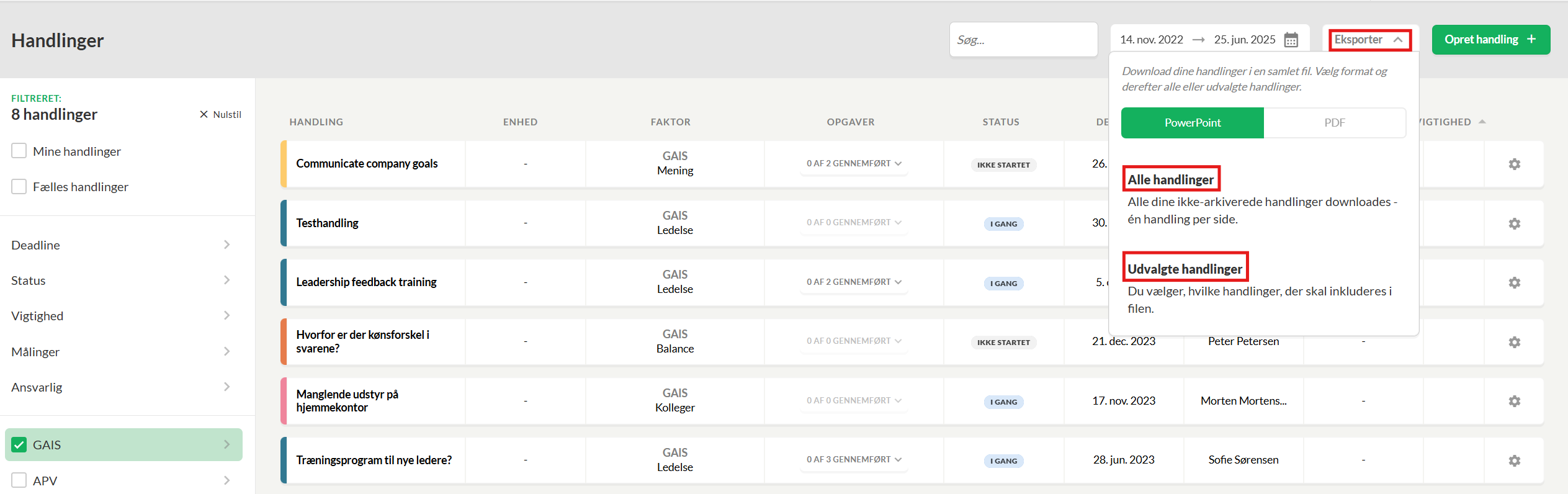 Via knappen Eksporter har du mulighed for at eksportere alle eller udvalgte handlinger til PowerPoint eller PDF.