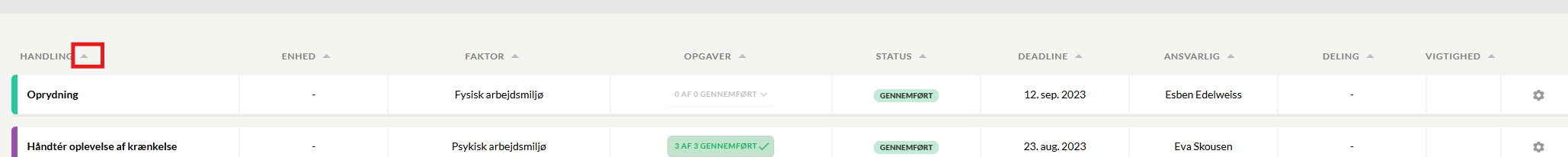 Via søgefunktionerne i menuen i venstre side kan du sortere og hente handlinger frem efter behov. Sortér fx i forhold til deadline, status, vigtighed, målingstype eller ansvarlig.