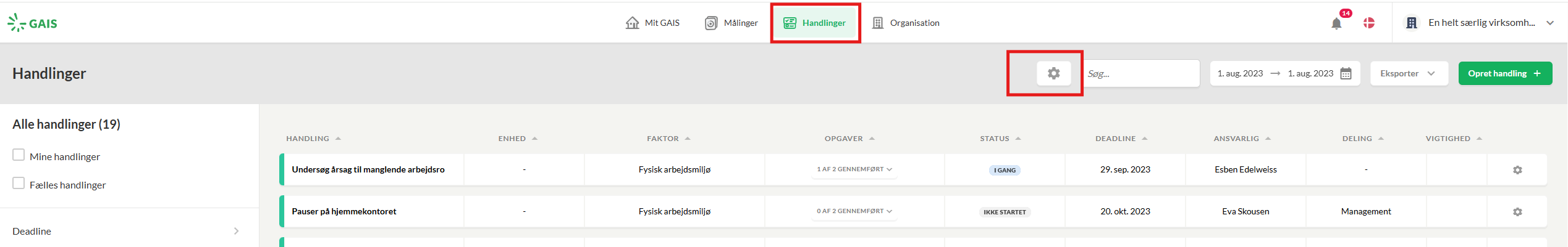 Under punktet Handlinger i den øverste bjælke finder du overblikket over alle dine oprettede handlinger og handlinger, der er delt med dig. Hvis du i virksomhedsprofilen har slået til, at administratorer kan se alle oprettede handlinger i organisationen, vil det samlede overblik fremgå her.
