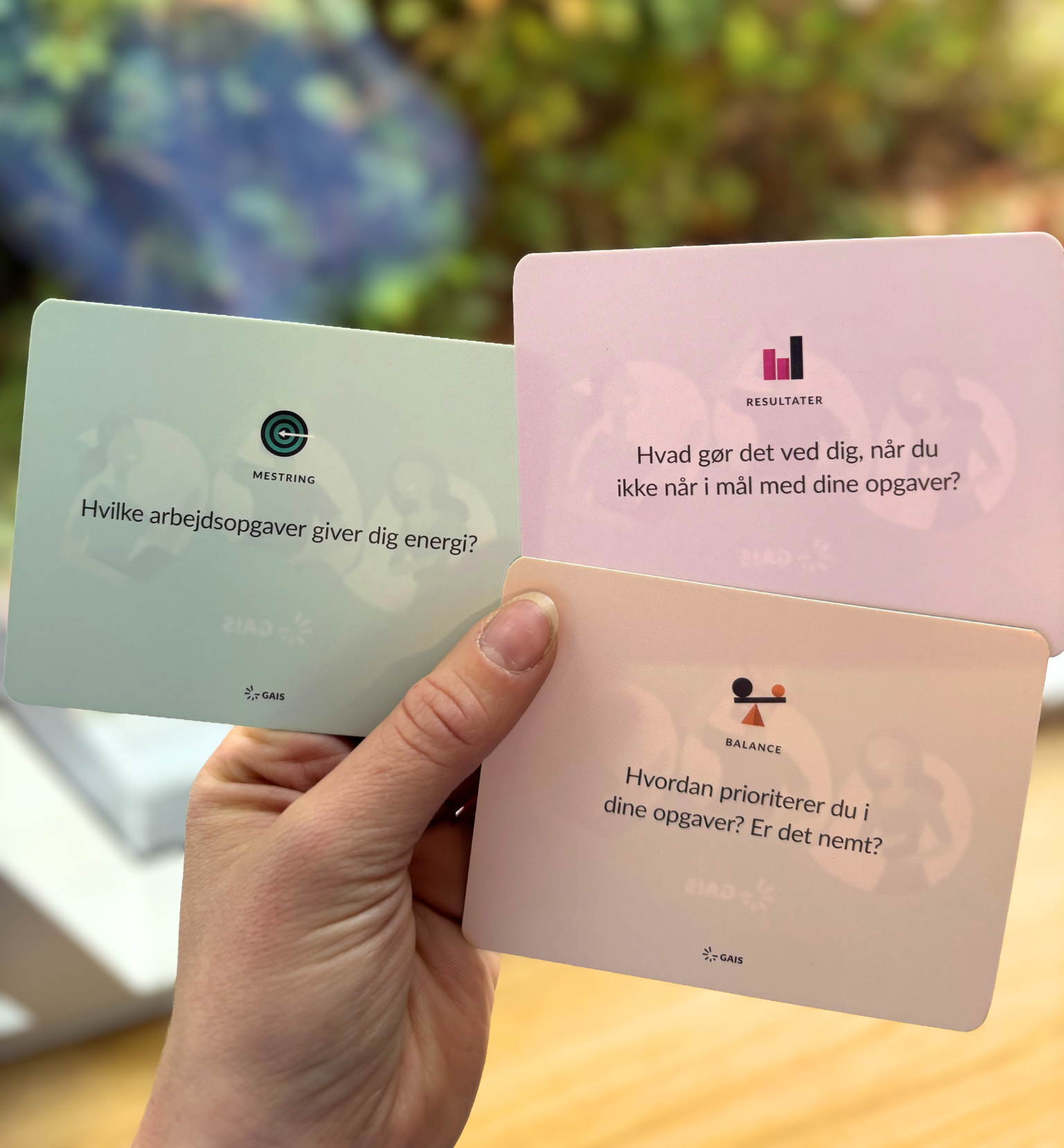 GAIS’ trivselskort gør det lettere at åbne samtalen. Hvert kort indeholder spørgsmål, der knytter sig til de syv faktorer i GAIS’ trivselsmåling samt den overordnede arbejdslyst. Spørgsmålene hjælper jer med at sætte ord på, hvad der styrker – og hvad der udfordrer – jeres trivsel i hverdagen.