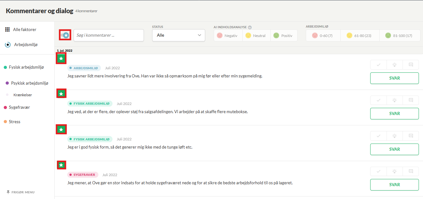 Du kan markere de kommentarer, du særligt skal huske eller arbejde videre med. Klik på stjernen, og kommentaren er markeret. Ved siden af søgefunktionen kan du swipe en stjerne til siden for kun at se dine markerede kommentarer.
