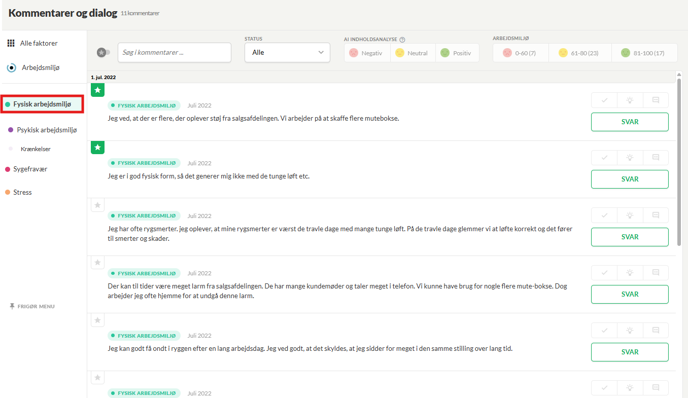 Vær opmærksom på, at medarbejdernes kommentarer er anonyme. Man kan altså ikke se, hvem der skrevet hvilke kommentarer. Det kan hverken administrator eller ledere. I den videre dialog kan det være gavnligt at opfordre medarbejderen til at give sig til kende overfor leder eller arbejdsmiljørepræsentant, når det gælder konkrete udfordringer inden for det fysiske arbejdsmiljø.